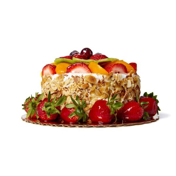 Beneath this dessert’s beautiful presentation awaits three moist layers of vanilla cake, sweet Bavarian cream, and vanilla whipped topping. Fresh strawberries, peaches, kiwis, and red grapes grace the top of the cake while toasted almonds hug the sides.