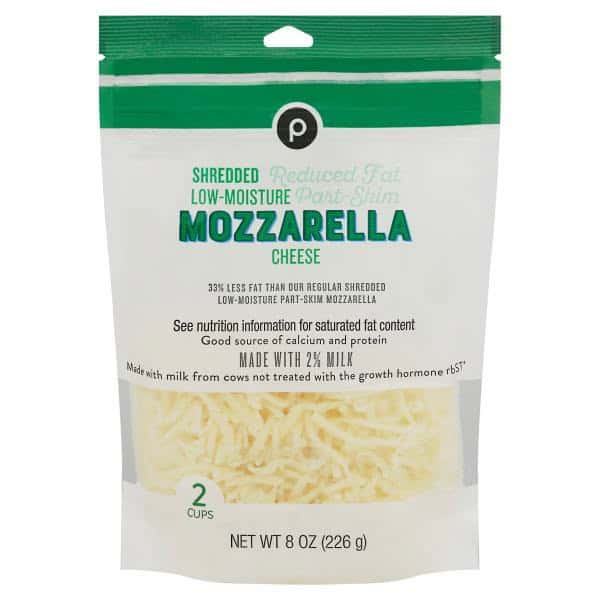 • 33% less fat than our regular shredded low-moisture part-skim mozzarella. See nutrition information for saturated fat content. Good source of calcium and protein. Reduced fat. Part-skim.
