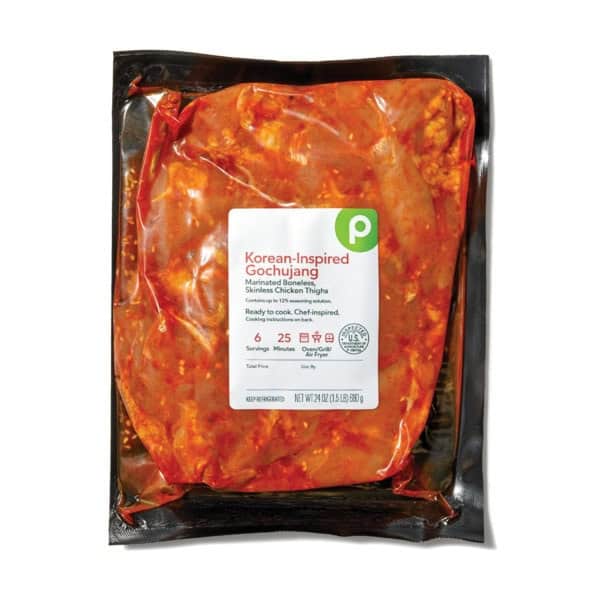 Chicken Thighs, Pepper Blend (gochugaro, Cayenne And Chili Peppers), Soy Sauce Powder (hydrolyzed Soy And Corn Protein, Corn Syrup Solids, Dextrin, Salt, Caramel Color, Dextrose), Ground Ginger, Garlic Powder, Onion Powder, Sesame Seed, Salt, Molasses Granules (cane Sugar, Molasses), Gochujang Powder(red Pepper Paste [rice, Salt, Red Pepper Powder, Soybean, Garlic, Onion], Maltodextrin), Natural Flavor, Canola Oil, Vinegar, Water.