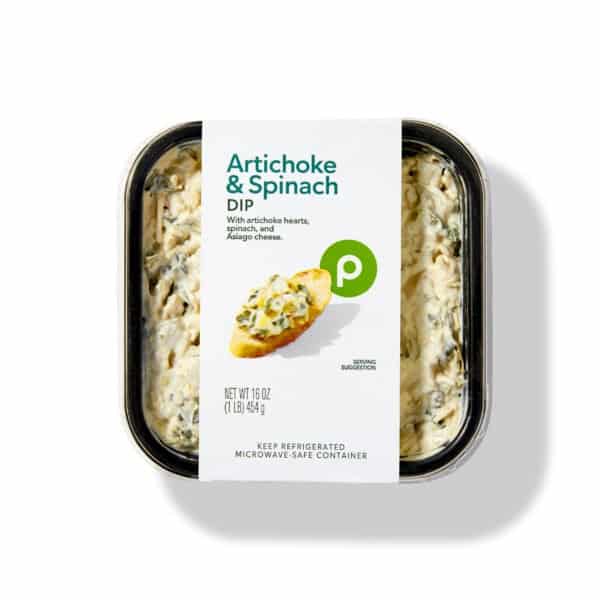Artichoke Hearts (Artichoke Hearts, Water, Salt, Citric Acid, Ascorbic Acid), Mayonnaise (Soybean Oil, Egg Yolks with Salt, Water, Vinegar, Sugar, Corn Syrup, Salt, Spice, Onion Powder, Garlic Powder, Calcium Disodium EDTA [Preservative]), Sour Cream (Cultured Pasteurized Cream and Milk, Whey, Modified Cornstarch, Sodium Phosphate, Guar Gum, Carrageenan, Calcium Sulfate, Locust Bean Gum, Potassium Sorbate [Preservative]), Spinach, Asiago Cheese (Cultured Pasteurized Milk, Salt, Enzymes, Natamycin [Natural Mold Inhibitor]), Water Chestnuts (with Citric Acid), Swiss Cheese (Part Skim Milk, Cheese Cultures, Salt, Enzymes, Natamycin [Natural Mold Inhibitor]), Parmesan Cheese (Pasteurized Milk, Cheese Cultures, Salt, Enzymes, Natamycin [Natural Mold Inhibitor]), Vegetable Soup Seasoning Mix (Dehydrated Vegetables [Carrots, Onions, Celery, Tomato, Garlic], Modified Potato Starch, Salt, Dextrose, Onion Powder, Xanthan and Guar Gum, Spices, Hydrolyzed Corn Protein), Minced Garlic (Garlic, Water, Phosphoric Acid), Onions, Seasoning Mix (Maltodextrin, Molasses Solids, Corn Syrup Solids, White Distilled Vinegar, Canola Oil, Salt, Garlic Powder, Sugar, Spice, Natural Flavor), Lemon Juice, Pepper Sauce (Distilled Vinegar, Red Pepper, Salt).