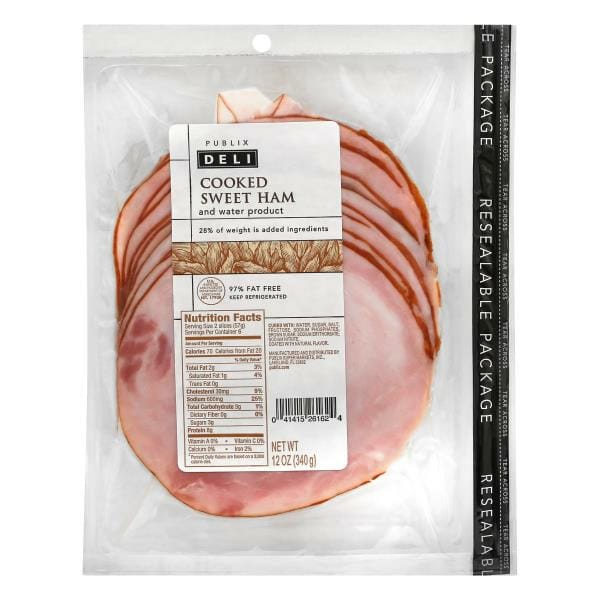 97% fat free. And water product. 28% of weight is added ingredients. US inspected and passed by Department of Agriculture. publix.com. Resealable package.