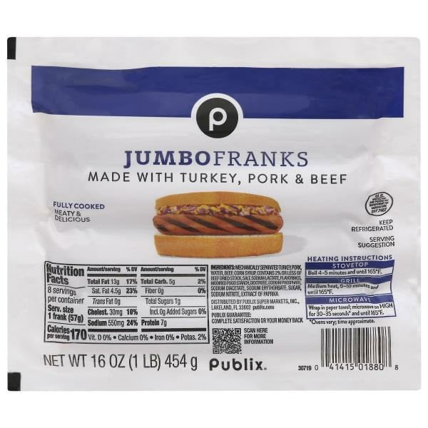 Made with turkey, pork & beef. Fully cooked. Meaty & delicious. Publix Guarantee: Complete satisfaction or your money back. U.S. inspected and passed by Department of Agriculture. publix.com. Scan for more information.