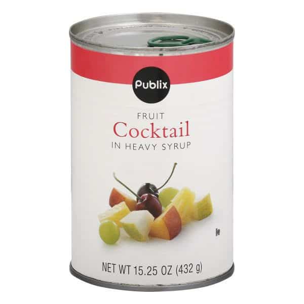 IngredientsDiced Peaches, Diced Pears, Water, Grapes, Corn Syrup, High Fructose Corn Syrup, Pineapple Sectors, Halved Cherries Artificially Colored Red with Carmine, Sugar.