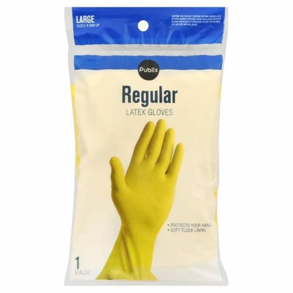 Sizes 8 and up. Protects your hands. Soft flock lining. Your hands are your home’s workhorses – washing, wiping, and scrubbing or painting, staining, and scraping. So whether you’re tackling regular weekly chores or a major cleaning project, protect them with Publix Latex Gloves. Lightweight, yet durable, with a natural contour fit, you’re sure to find the perfect gloves for every task. Keep a couple of varieties handy for everything from coloring your hair to cleaning the oven. And care for your hands while you take care of your household. Anti-Slip Grip: A sink full of soapy water, bare hands, and a few glasses can be a recipe for disaster. Thanks to the textured palms and fingers of Publix Latex Gloves, Sensitive Skin, and Supreme Latex Gloves, you can confidently wash dishes, scrub tile, and handle just about any tough chore at your house. Our gloves provide a surer grip on wet, slippery dishes, sponges, buckets, and more. So you can concentrate on cleaning up, safely. Flexibility: Our gloves provide hand protection with maximum flexibility so you can easily pick up straight pins, spare change, and other small stuff that gets caught in the vacuum cleaner, rolls out from under the bed, or otherwise turns up on your floors or countertops. Pick up loose change in the living room, pens from behind the washer, or just separate sticky plates in the sink with ease, thanks to Publix Latex Gloves. Lining: Publix Latex Gloves and Supreme Latex Gloves are lined with flocking for extra strength and comfort. Our Sensitive Skin Gloves are specially treated to protect against skin rashes and irritations. Apply your favorite hand lotion liberally to hands before putting gloves on and soothe your hands while you work. publix.com. Publix Guarantee: Complete satisfaction or your money back. Product of Malaysia.