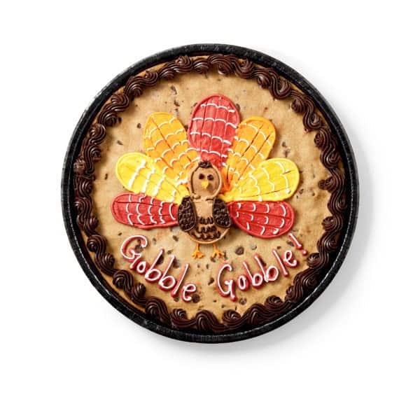 Our Gobble Up the Cookie Cake is sure to be the talk of your holiday dinner, especially at the kids’ table. Decorated with fudge and frosting, this 12–inch chocolate chip cookie features an inviting little turkey who sweetly beckons in buttercream to gobble gobble” him up. With that kind of turkey talk, don’t expect any leftovers! Serves 10.