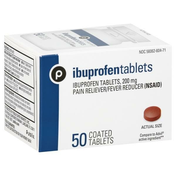 Other Information: Read all warnings and directions before use. Store at 68 degrees – 77 degrees F (20 degrees – 25 degrees C). Avoid high humidity and excessive heat above 104 degrees F (40 degrees C). Misc: Ibuprofen tablets, 200 mg. Pain reliever/Fever reducer (NSAID). Compare to Advil active ingredient (This product is not manufactured or distributed by Wyeth LLC, owner of the registered trademark Advil). Publix Guarantee: Complete satisfaction or your money back. publix.com.
