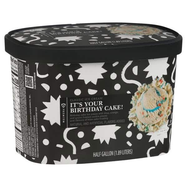 Birthday cake ice cream with blue, orange, and green frosted cookie pieces and ribbons of blue cake frosting. Natural and artificial flavors added. Publix Guarantee: Complete satisfaction or your money back. publix.com. Scan for more information.