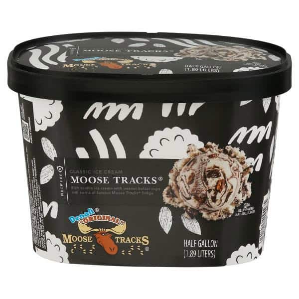 Milk, Cream, Moose Tracks Fudge (Powdered Sugar [Sugar, Cornstarch], Vegetable Oil [Peanut and/or Cottonseed and/or Palm Oil], Cocoa [Processed with Alkali], Whey, Soy Lecithin, Salt, Natural Flavor), Sugar, Peanut Butter Cups (Sugar, Peanut Butter [Peanuts, Salt], Coconut Oil, Nonfat Milk, Milk, Cocoa [Processed with Alkali], Soy Lecithin [Emulsifier], Natural Flavors), Corn Syrup, Vanilla Extract, Stabilizer (Carob Bean Gum, Guar Gum).