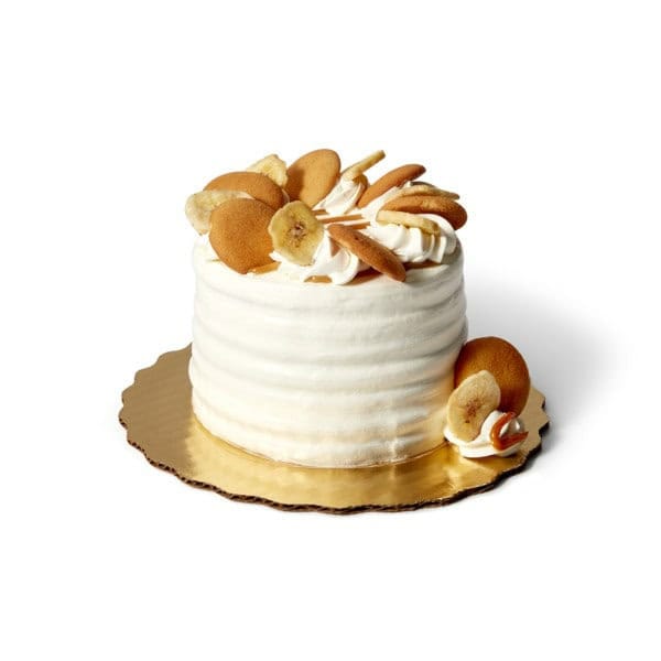 Vanilla mini cake filled with banana Bavarian cream and dulce de leche. Iced with banana Bavarian cream, garnished with dulce de leche, vanilla wafers, and banana chips.