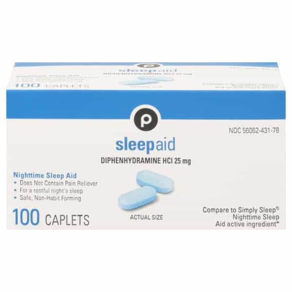 Active Ingredients: In Each Caplet: Diphenhydramine HCl (25 mg). Purpose: Nighttime Sleep-Aid. Inactive Ingredients: Carnauba Wax, Crospovidone, Dibasic Calcium Phosphate Dihydrate, FD&C Blue 1 Aluminum Lake, FD&C Blue 2 Aluminum Lake, Hypromellose, Magnesium Stearate, Microcrystalline Cellulose, Polyethylene Glycol, Polysorbate 80, Pregelatinized Starch, Stearic Acid, Titanium Dioxide.