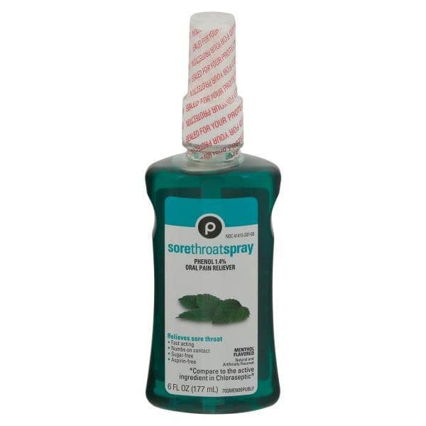 Active Ingredients: Phenol (1.4%). Purpose: Oral Anesthetic/Analgesic. Inactive Ingredients: Flavor, Glycerin, Green 3, Green 5, Purified Water, Saccharin Sodium, Yellow 10.