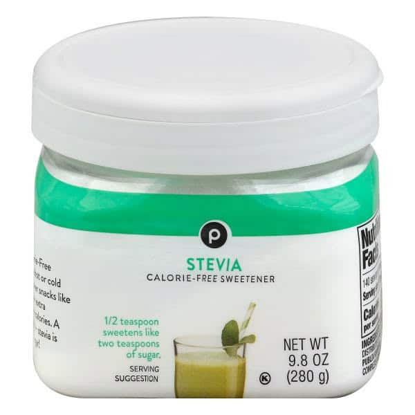 DetailsPublix Stevia.Calorie-free sweetener.1/2 Teaspoon sweetens like two teaspoons of sugar.Net Wt 9.8 oz (280 g).