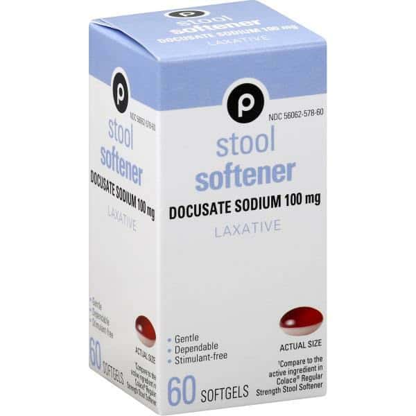 Active Ingredients: (In Each Softgel) Docusate Sodium (100 mg). Purpose: Stool Softener Laxative. Inactive Ingredients: D&C Red 33, Edible Ink, FD&C Blue 1 (Contains One or More of These Ingredients), FD&C Red 40, FD&C Yellow 6, Gelatin, Glycerin, Polyethylene Glycol, Propylene Glycol (Contains One or More of These Ingredients), Purified Water, Sorbitan, Sorbitol, Titanium Dioxide.