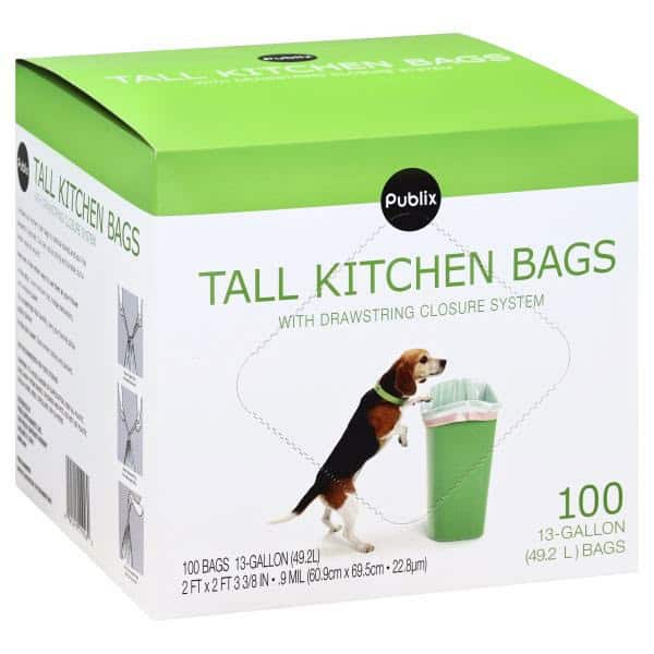 2 ft. x 2 ft. 3-3/8 in. 0.9 mil. Compare our kitchen trash bags to national brands and you’ll be pleasantly surprised. Ours are just as strong and durable, but a better value all around. Here are a few other ways to use them at your house: In The Attic: Store heirloom toys, holiday decorations, and wrapping paper. On a Road Trip: Haul laundry, carry your favorite pillow and/or blanket. In the Hall Closet: Store winter clothes and blankets. Not recommended for food storage. publix.com. Publix Guarantee: Complete satisfaction or your money back.