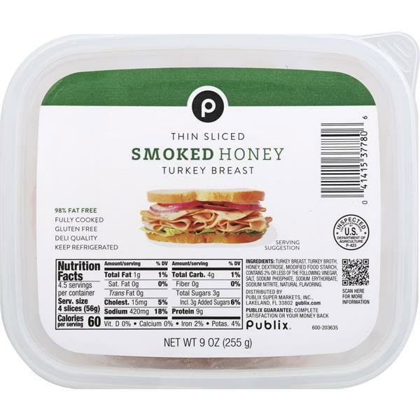 Gluten free. 98% fat free. Fully cooked. Deli quality. Publix Guarantee: Complete satisfaction or your money back. Inspected for wholesomeness by US Department of Agriculture. publix.com. Scan for more information.