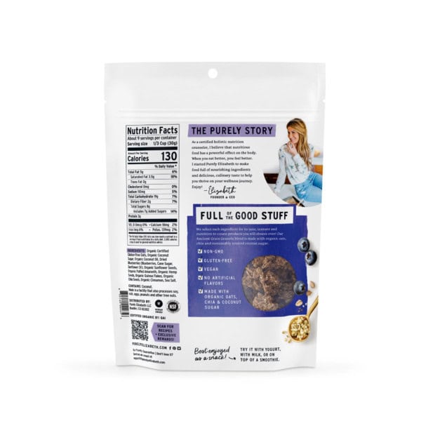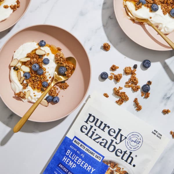 Purely Elizabeth Blueberry Hemp Ancient Grain Granola is made with organic oats and sweetened with sustainably sourced coconut sugar. Our Blueberry Hemp Ancient Grain Granola recipe features blueberries and nutty hemp seeds, giving you salty-sweet clusters that have a crunchy texture and irresistible taste.