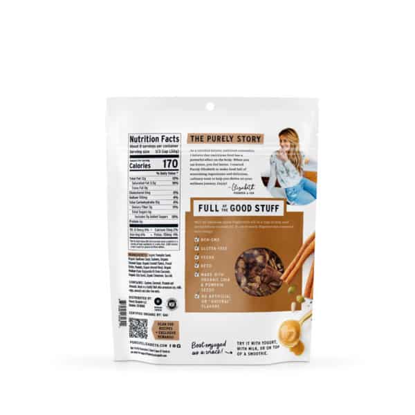 Purely Elizabeth Grain Free Cinnamon Peanut Butter Granola is made with creamy peanut butter and hints of cinnamon. Our keto nut granola recipe has nuts, superfood seeds and coconut sugar for a crunchy texture and delicious salty sweet taste. It is all the flavor you crave, free of oats and grains! Enjoy our grain free granola with milk, fresh fruit and yogurt, on oatmeal or on its own as a keto snack.