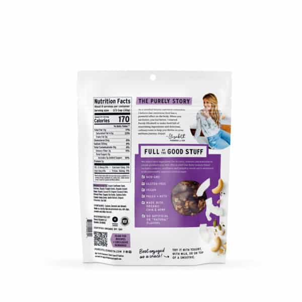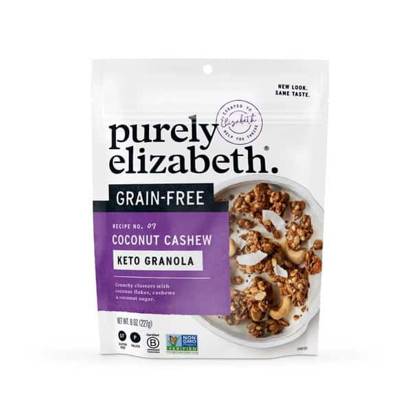 Purely Elizabeth’s coconut cashew Grain-Free Granola is made with clusters of nuts and super food seeds combined with rich cashews, dried coconut flakes and sweetened with sustainably sourced coconut sugar, giving you salty-sweet clusters that have a crunchy texture and irresistible taste. It’s all of the flavor you crave, free of oats and grains!