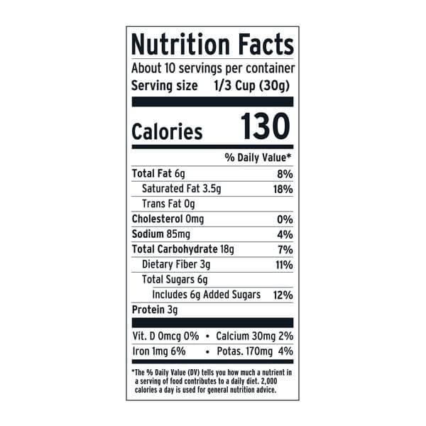 Organic Certified Gluten-free Oats, Organic Coconut Sugar, Organic Coconut Oil, Chocolate Chunks (cane Sugar, Unsweetened Chocolate, Cocoa Butter), Organic Certified Gluten-free Oat Flour, Maple Syrup, Almond Butter, Cocoa Processed With Alkali, Chicory Root Fiber, Organic Coconut Flour, Organic Chia Seeds, Natural Flavor, Leavening (cream Of Tartar, Baking Soda), Sea Salt