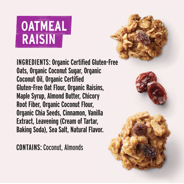 Organic Certified Gluten-free Oats, Organic Coconut Sugar, Organic Coconut Oil, Organic Certified Gluten-free Oat Flour, Organic Raisins, Maple Syrup, Almond Butter, Chicory Root Fiber, Organic Coconut Flour, Organic Chia Seeds, Cinnamon, Vanilla Extract, Leavening (cream Of Tartar, Baking Soda), Sea Salt, Natural Flavor