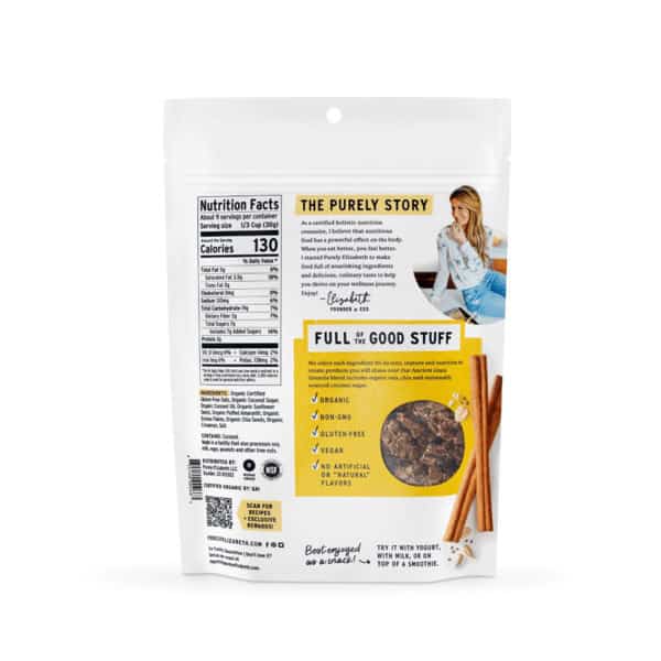 Purely Elizabeth Organic Original Ancient Grain Granola has organic oats, coconut sugar, and hints of cinnamon. Our gluten free granola recipe has superfood grains and seeds for a crunchy texture, and delicious salty sweet taste. Enjoy Purely Elizabeth granola with milk, fresh fruit and yogurt, on oatmeal, or by itself!