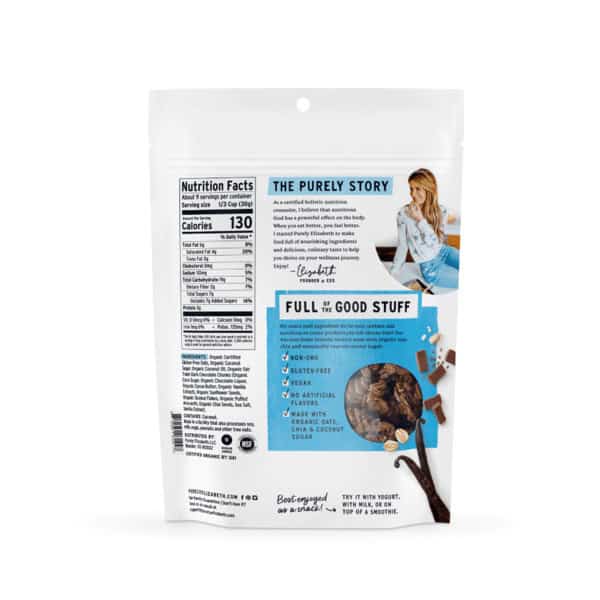 Purely Elizabeth Vanilla Chocolate Chip Ancient Grain Granola is made with organic oats, coconut sugar and fair trade chocolate chunks. Our gluten free granola recipe has superfood grains and seeds for a crunchy texture, and delicious salty sweet taste with hints of vanilla. Enjoy Purely Elizabeth granola with milk, fresh fruit and yogurt, on oatmeal, or by itself!