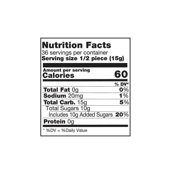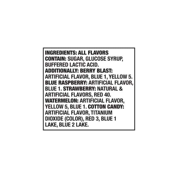 Sugar, Glucose Syrup, Buffered Lactic Acid, Artificial Flavor, Blue 1, Yellow 5.
