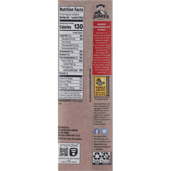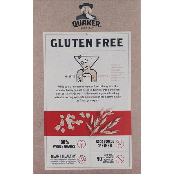 100% whole grain oats. Gluten Free Advanced Sorting: While oats are inherently gluten free, other grains like wheat or barley can get mixed in during storage and even transportation. But Quaker developed a ground breaking, patented sorting system that removes these other grains to deliver gluten-free oatmeal with the nutrition you expect. Quaker has developed and adheres to multiple quality checks with stringent testing standards. Diets rich in whole grain foods and other plant foods and low in saturated fat and cholesterol may help reduce the risk of heart disease. Made with whole grains to provide a good source of fiber, and energy to help keep you going. Quaker sustainability pledge. We value our communities and are continually on the lookout for ways to reduce our environmental impact – especially in areas of oat farming, packaging, and shipping. We’ve made progress, but there’s more work to be done. Join us in our journey to take better care of the Earth. After all, that’s where oats come from.