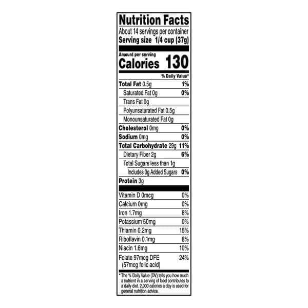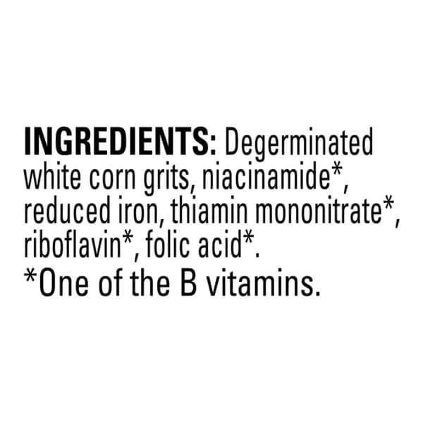 Degerminated White Corn Grits, Niacinamide*, Reduced Iron, Thiamin Mononitrate*, Riboflavin*, Folic Acid*.