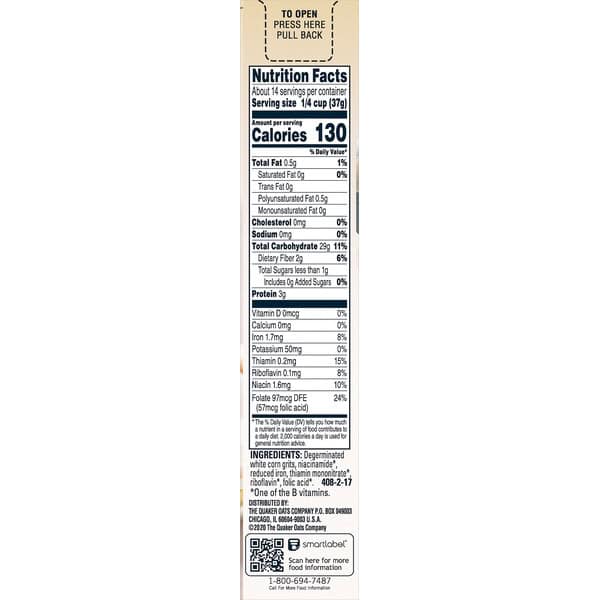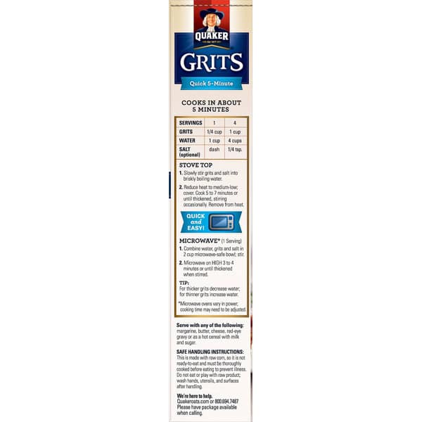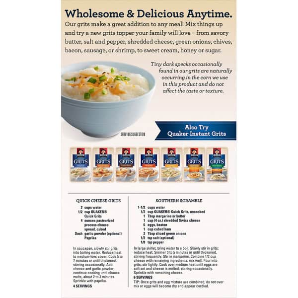 Smooth & creamy texture. Enriched white hominy corn. Per 1/4 Cup Serving: 130 calories; 0g sat fat, 0% DV; 0 mg sodium, 0% DV; less than 1g total sugars. Est. 1877. Wholesome & delicious anytime. Our grits make a great addition to any meal! Mix things up and try a new grits topper your family will love – from savory butter, salt and pepper, shredded cheese, green onions, chives, bacon, sausage, or shrimp, to sweet cream, honey or sugar. Tiny dark specks occasionally found in our grits are naturally occurring in the corn we use in this product and do not affect the taste or texture. Quick and easy! Quakeroats.com. SmartLabel: Scan here for more food information. 1-800-694-7487 Call for more food information. We’re here to help. Quakeroats.com or 800-694-7487. Please have package available when calling. Also try Quaker instant grits: Quaker instant grits original; Quaker instant grits cheddar cheese; Quaker instant grits country bacon; Quaker instant grits red eye gravy & country ham; Quaker instant grits butter; Quaker instant grits cheese lovers; Quaker instant grits flavor variety.