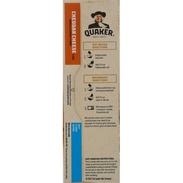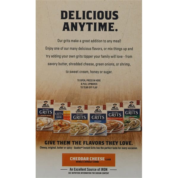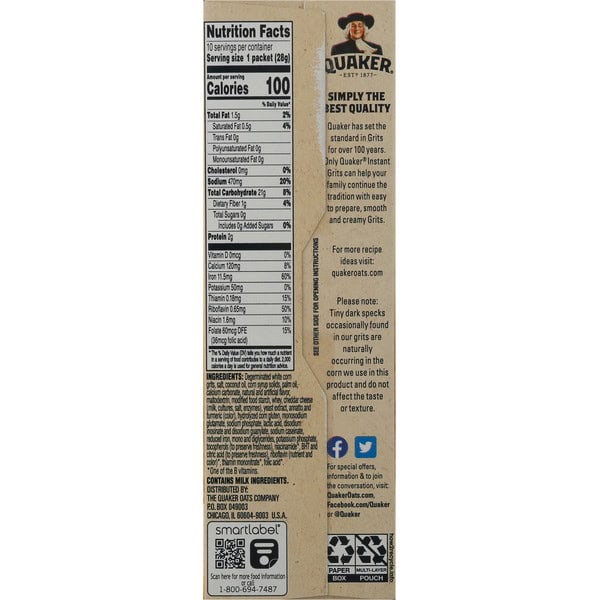 Same delicious taste. Ready in 2 mins. Estd. 1877. Toppings added as serving suggestion. Delicious anytime. Our grits make a great addition to any meal! Enjoy one of our many delicious flavors, or mix things up and try adding your own grits topper your family will love – from savory butter, shredded cheese, green onions, or shrimp, to sweet cream, honey or sugar. Simply the best quality. Quaker has set the standard in Grits for over 100 years. Only Quaker Instant Grits can help your family continue the tradition with easy to prepare, smooth and creamy Grits. Please note: Tiny dark specks occasionally found in our grits are naturally occurring in the corn we use in this product and do not affect the taste or texture.