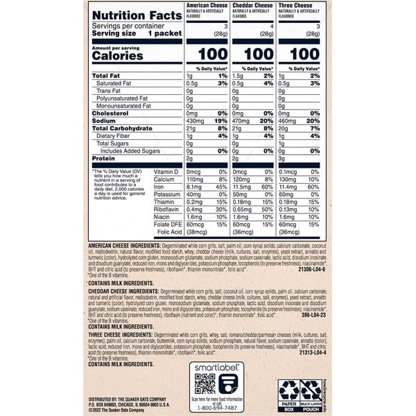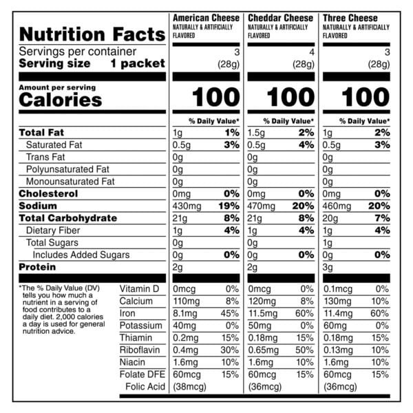 American Cheese – Degerminated White Corn Grits, Salt, Palm Oil, Corn Syrup Solid, Calcium Carbohydrate, Coconut Oil, Maltodextrin, Natural Flavor, Modified Food Starch, Whey, Cheddar Cheese (milk, Cultures, Salt, Enzymes), Yeast Extracts, Annatto And Turmeric (color), Hydrolyzed Corn Gluten, Monosodium Glutamate, Sodium Phosphate, Sodium Caseinate, Lactic Acid, Disodium Inosinate, Disodium Guanylate, Reduced Iron, Mono And Diglycerides, Potassium Phosphate, Tocopherols (to Preserve Freshness), Niacinamide*, Bht And Citric Acid (to Preserve Freshness), Riboflavin*, Thiamin Mononitrate*, Folic Acid*, *one Of The B Vitamins,cheddar Cheese – Degerminated White Corn Grits, Salt, Coconut Oil, Corn Syrup Solids, Palm Oil, Calcium Carbonate, Natural And Artificial Flavors, Maltodextrin, Modified Food Starch, Whey, Cheddar Cheese (milk, Cultures, Salt, Enzymes), Yeast Extract, Annatto And Turmeric (color), Hydrolyzed Corn Gluten, Monosodium Glutamate, Sodium Phosphate, Lactic Acid, Disodium Inosinate, Disodium Guanylate, Sodium Caseinate, Reduced Iron, Mono And Diglycerides, Potassium Phosphate, Tocopherols (to Preserve Freshness), Niacinamide*, Bht And Citric Acid (to Preserve Freshness), Riboflavin (nutrient And Color)*, Thiamin Mononitrate*, Folic Acid*, *one Of The B Vitamins,three Cheese – Degerminated White Corn Grits, Whey, Salt, Romano/cheddar/parmesan Cheeses (milk, Vultures, Salt, Enzymes), Palm Oil, Calcium Carbonate, Buttermilk, Corn Syrup Solid, Sodium Phosphate, Natural Flavor, Sodium Casseinate, Annatto (color), Lactic Acid, Reduced Iron, Mono And Diglycerides, Potassium Phosphate, Tocopherols (to Preserve Freshness), Niacinamide*, Bht And Citric Acid (to Preserve Freshness), Thiamin Mononitrate*, Riboflavin*, Folic Acid*, *one Of The B Vitamins