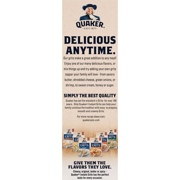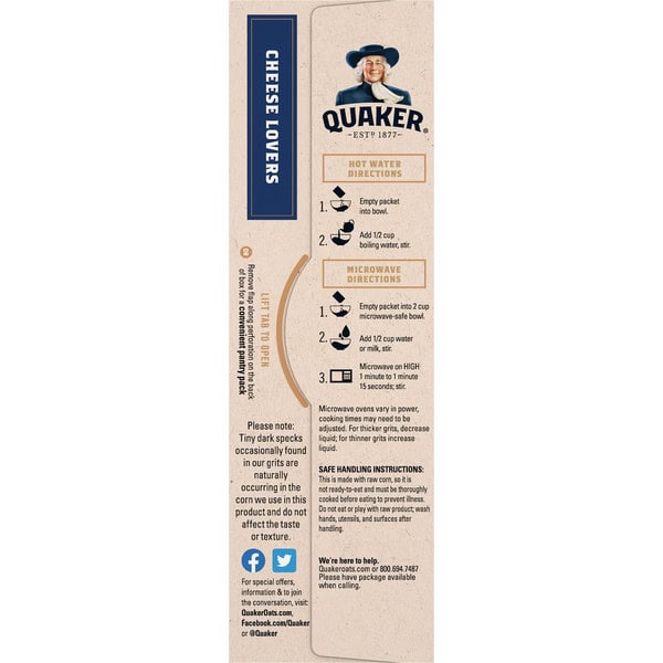 Cheese Lover. Est 1877. Same delicious taste. Please Note: Tiny dark specks occasionally found in our grits are naturally occurring in the corn we use in this product and do not affect the taste or texture. Delicious anytime. Our grits make a great addition to any meal! Enjoy one of our many delicious flavors, or mix things up and try adding your own grits topper your family will love – from savory butter, shredded cheese, green onions, or shrimp, to sweet cream, honey or sugar. Simply the best quality quaker has set the standard in grits for over 100 years. Only quaker instant grits can help your family continue the tradition with easy to prepare, smooth and creamy grits. For more recipe ideas visit: quakeroats.com.