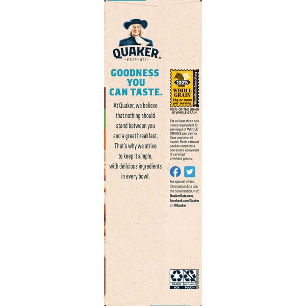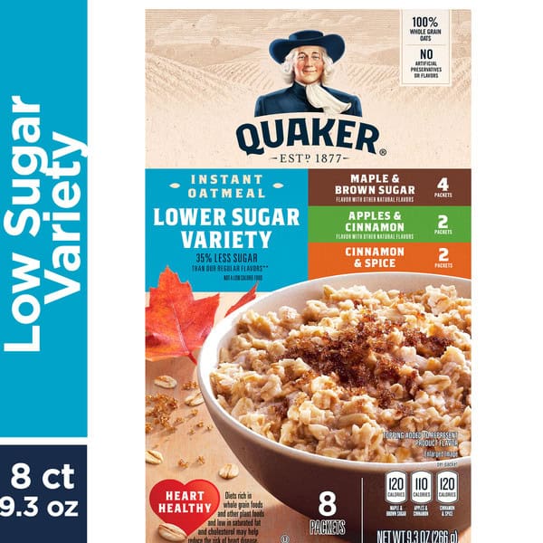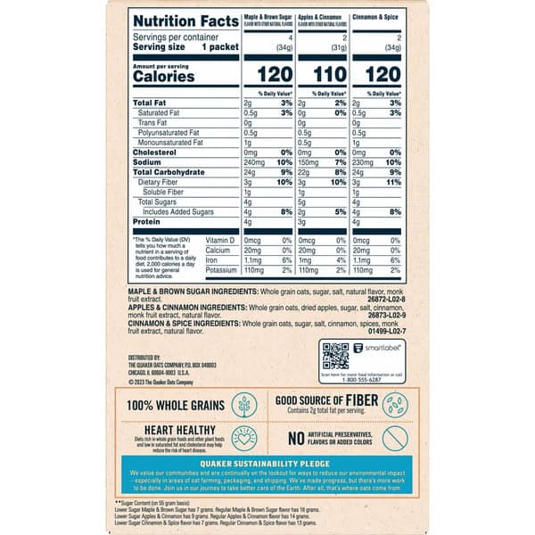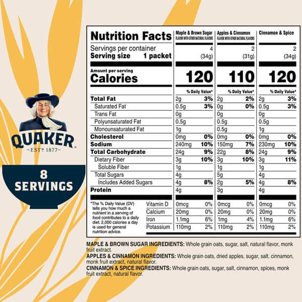 Quaker Instant Oatmeal Maple And Brown Sugar: Whole Grain Oats, Sugar, Salt, Natural Flavor, Monk Fruit Extract. Quaker Instant Oatmeal – Apple Cinnamon: Whole Grain Oats, Dried Apples, Sugar, Salt, Cinnamon, Monk Fruit Extract, Natural Flavor. Quaker Instant Oats Cinnamon Spice: Whole Grain Oats, Sugar, Salt, Cinnamon, Spices, Monk Fruit Extract, Natural Flavor.