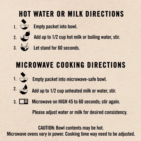 Hot Water or Milk Directions: 1. Empty packet into bowl. 2. Add up to 1/2 cup hot milk or boiling water, stir. 3. Let stand for 60 seconds. Microwave Directions: 1. Empty packet into microwave-safe bowl. 2. Add up to 1/2 cup unheated milk or water, stir. For your convenience, you can use the packet as a measuring cup. 3. Microwave on high 45 to 60 seconds; stir again. Please adjust water or milk for desired consistency. Caution: Bowl and contents may be hot. Microwave ovens vary in power. Cooking time may need to be adjusted.