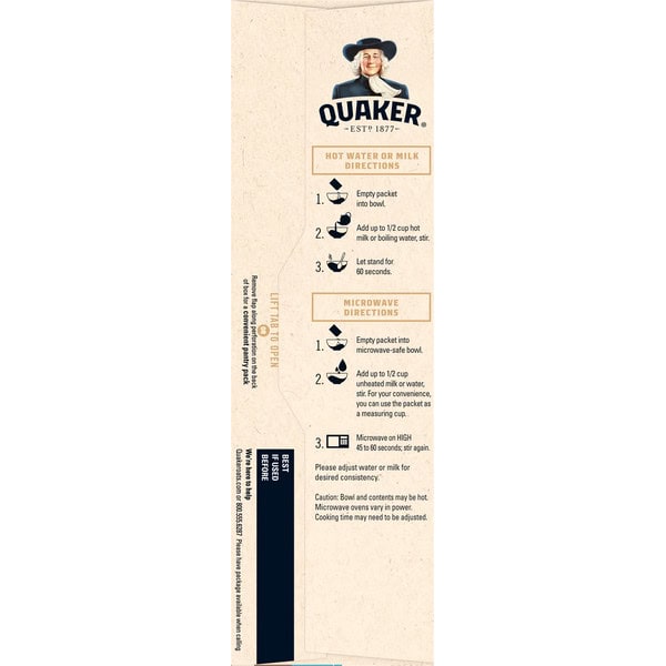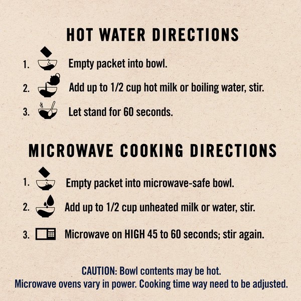 Microwave Directions: 1. Empty packet into microwave-safe bowl. 2. Add up to 1/2 cup unheated milk or water, stir. For your convenience, you can use the packet as a measuring cup. 3. Microwave on high 45 to 60 seconds; Stir again. Please adjust water or milk for desired consistency. Hot water or milk directions: 1. Empty packet into bowl. 2. Add up to 1/2 cup hot milk or boiling water, stir. 3. Let stand for 60 seconds. Caution: Bowl and contents may be hot. Microwave ovens vary in power. Cooking time may need to be adjusted.