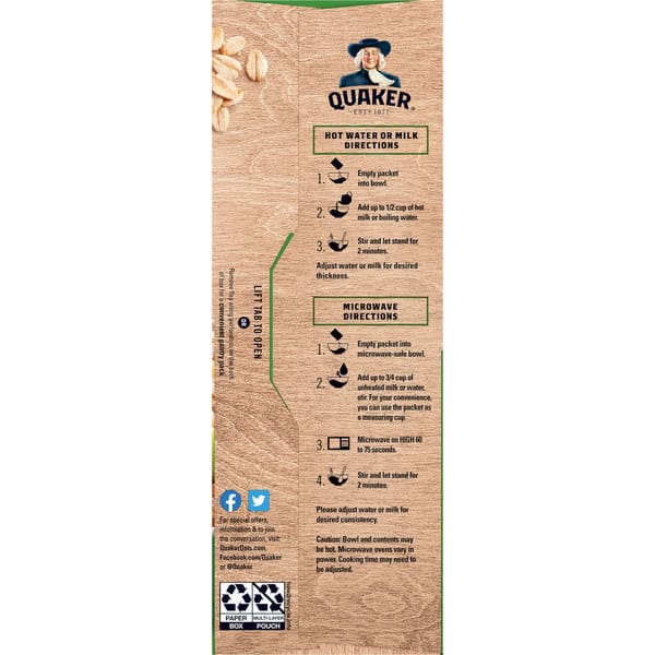 Hot Water or Milk Directions: 1. Empty packet into bowl. 2. Add up to 1/2 cup of hot milk or boiling water. 3. Stir and let stand for 2 minutes. Adjust water or milk for desired thickness. Microwave Directions: 1. Empty packet into microwave-safe bowl. 2. Add up to 3/4 cup of unheated milk or water, stir. For your convenience, you can use the packet as a measuring cup. 3. Microwave on high 60 to 75 seconds. 4. Stir and let stand for 2 minutes. Please adjust water or milk for desired consistency. Caution: Bowl and contents may be hot. Microwave ovens vary in power. Cooking time may need to be adjusted.