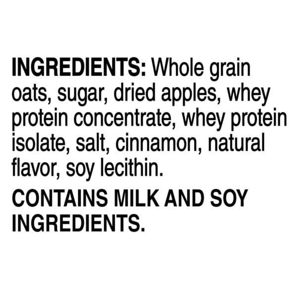 Whole Grain Oats, Sugar, Dried Apples, Whey Protein Concentrate, Whey Protein Isolate, Salt, Cinnamon, Natural Flavor, Soy Lecithin.