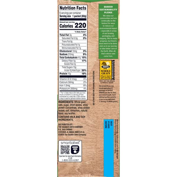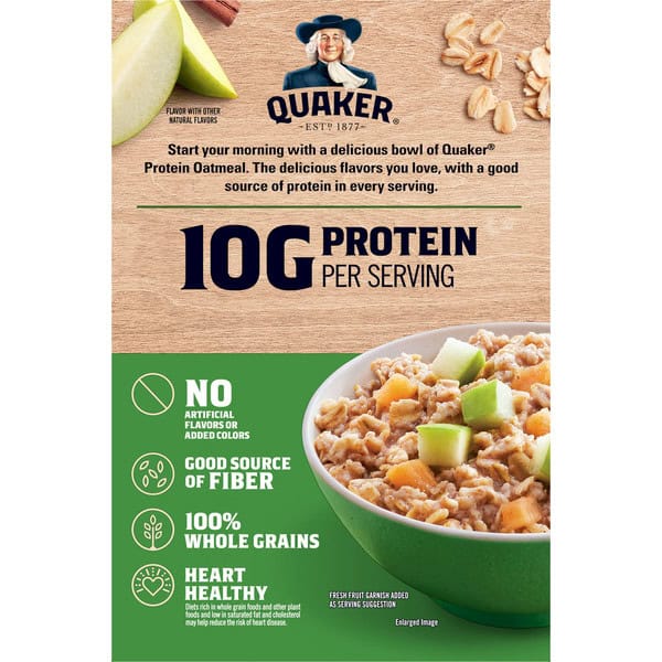 Estd 1877. Start your morning with a delicious bowl of Quaker protein oatmeal. The delicious flavors you love, with a good source of protein in every serving. Quaker Sustainability Pledge: We value our communities and are continually on the lookout for ways to reduce our environmental impact -especially in areas of oat farming, packaging, and shipping. We’ve made progress, but there’s more work to be done. Join us in our journey to take better care of the Earth. After all, that’s where oats come from.