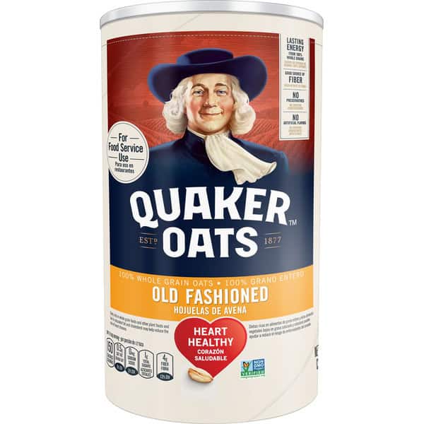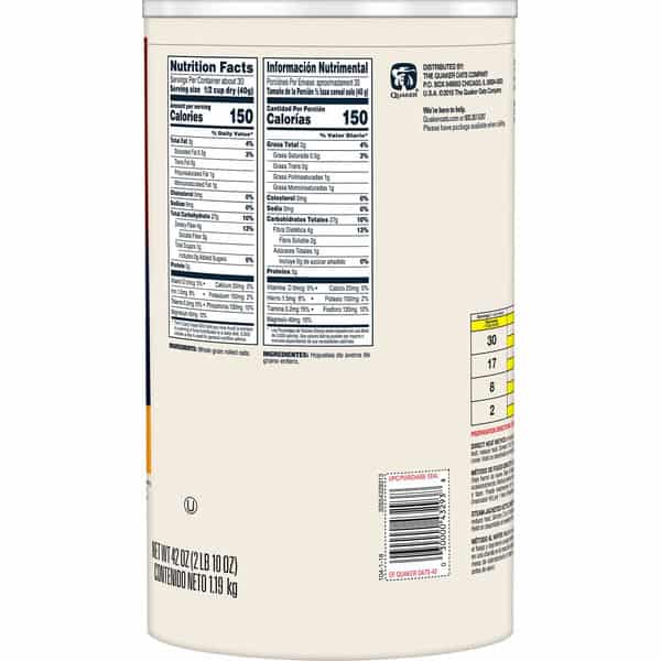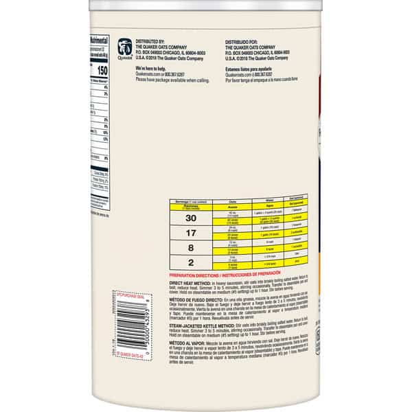 No artificial flavors. Per 1/2 Cup Serving: 150 calories; 0.5 g sat fat (3% DV); 0 mg sodium (0% DV); 1 g total sugars; 4 g fiber (13% DV). 100% whole grain oats. Hearty healthy. Diets rich in whole grain foods and other plant foods and low in saturated fat and cholesterol may help reduce the risk of heart disease. Good source of fiber. Non GMO Project verified. nongmoproject.org. Estd 1887. Lasting energy from 100% whole grains. For food service use. No preservatives. Quakeroats.com. We’re here to help. Quakeroats.com or 800-367-6287. Please have package available when calling.