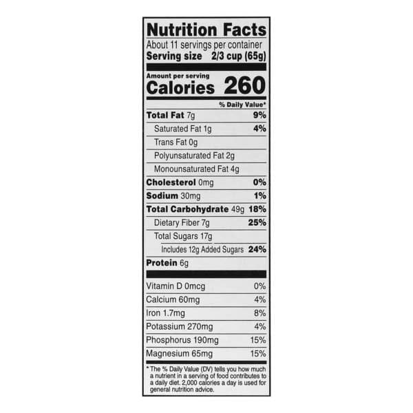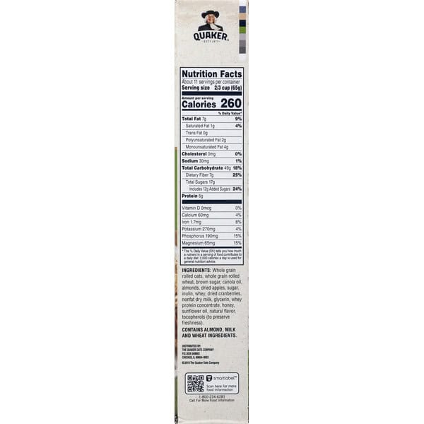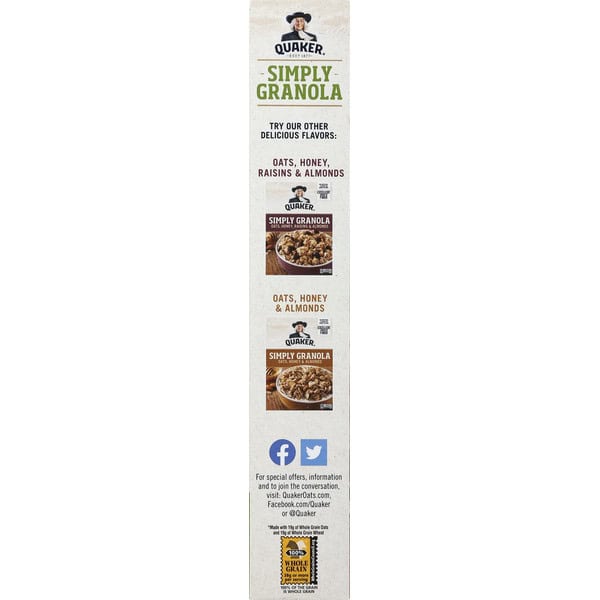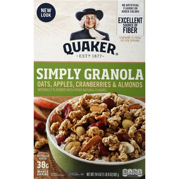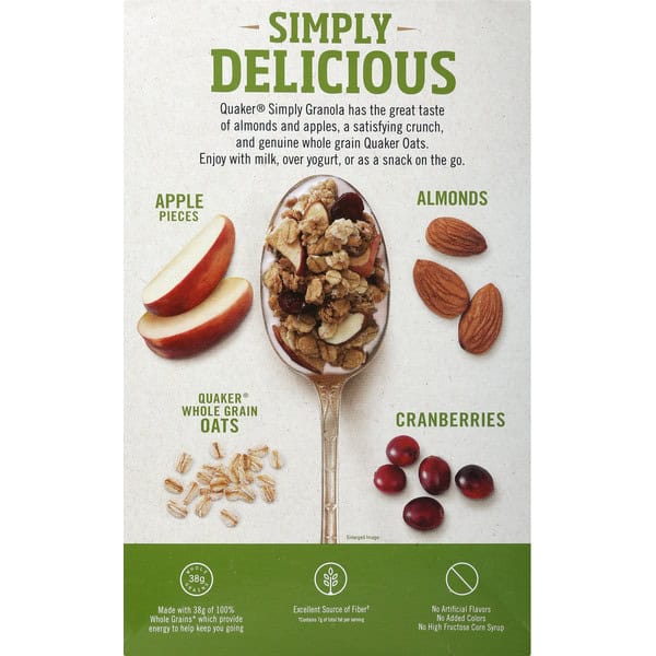 Naturally flavored with other natural flavors. No artificial flavors. 260 calories; 1 g sat fat (4% DV); 30 mg sodium (1% DV); 17 g total sugars. 100% Whole Grain: 38 g or more per serving. 100% of the grain is whole grain. WholeGrainsCouncil.org. Excellent source of fiber (Contains 7 g of total fat per serving). Estd 1877. New look. Made with Quaker Oats (Made with 19 g of whole grain oats and 19 g of whole grain wheat). Simply delicious. Quaker Simply Granola has the great taste of almonds and apples, a satisfying crunch, and genuine whole grain Quaker Oats. Enjoy with milk, over yogurt, or as a snack on the go. Apple pieces. Almonds. Quaker whole grain oats. Cranberries. Made with 38 g of 100% whole grains (Made with 19 g of whole grain oats and 19 g of whole grain wheat) which provide energy to help keep you going. No added colors. No high fructose corn syrup. Quakeroats.com. SmartLabel: Scan for more food information. 1-800-234-6281 call for more food information. Facebook. Twitter. For special offers, information and to join the conversation, visit QuakerOats.com, Facebook.com/Quaker or (at)Quaker. We’re here to help. Quakeroats.com or 800.234.6281. Please have package available when calling. Try our other delicious flavors: Oats, Honey, Raisins & Almonds; Oats, Honey & Almonds.