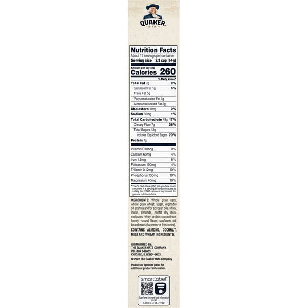 Whole Grain Oats, Whole Grain Wheat, Sugar, Vegetable Oil (canola And/or Soybean Oil), Whey, Inulin, Almonds, Nonfat Dry Milk, Molasses, Whey Protein Concentrate, Honey, Natural Flavor, Sunflower Oil, Tocopherols (to Preserve Freshness). Contains Almond, Coconut, Mik And Wheat Ingredients.