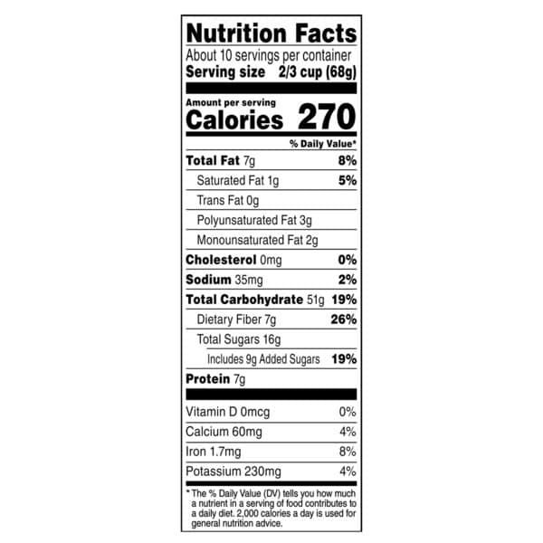 Whole Grain Oats, Whole Grain Wheat, Brown Sugar, Raisins (raisins, Glycerin), Canola Oil, Whey, Inulin, Almonds, Nonfat Dry Milk, Whey Protein Concentrate, Honey, Natural Flavor (contains Coconut Ingredients), Sunflower Oil, Tocopherols (to Preserve Freshness). Contains Almond, Coconut, Milk And Wheat Ingredients.