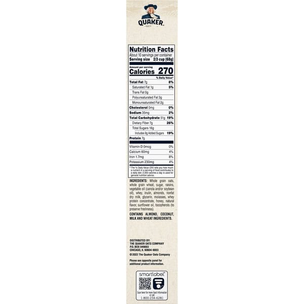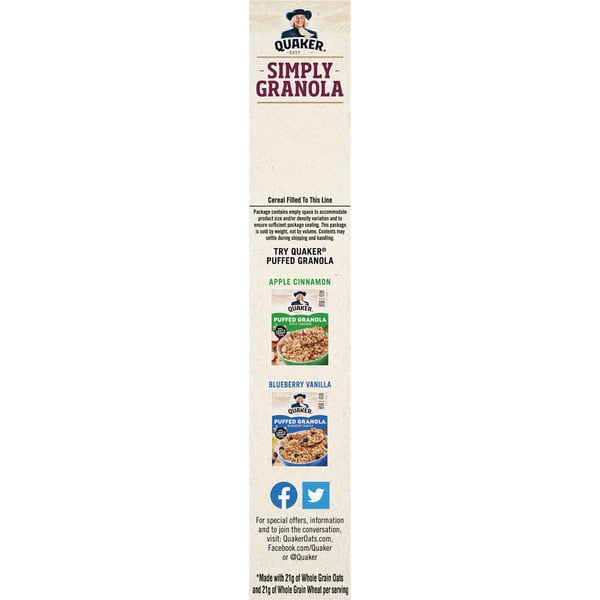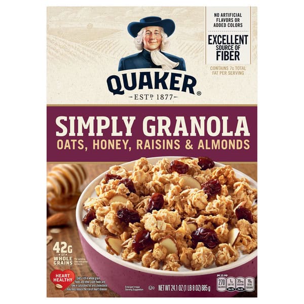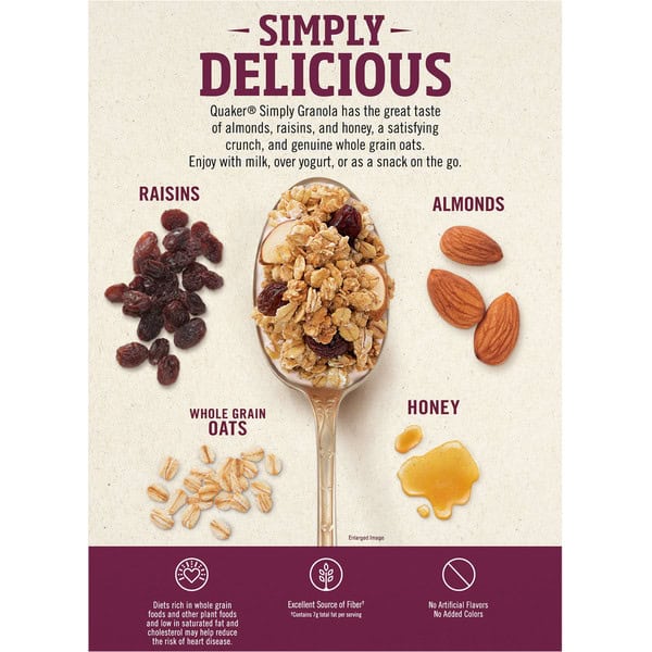 Estd. 1877. Simply Delicious: Quaker Simply Granola has the great taste of almonds, raisins, and honey, a satisfying crunch, and genuine whole grain oats. Enjoy with milk, over yogurt, or as a snack on the go. Raisins, almonds. whole grain oats, honey. No added color. Package contains empty space to accommodate product size and/or density variation and to ensure sufficient package sealing. This package is sold by weight, not by volume. Contents may settle during shipping and handling. Please see opposite panel for additional product information.