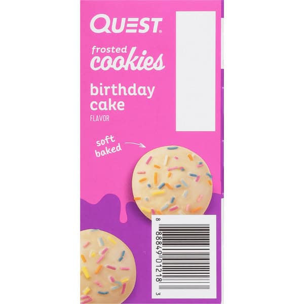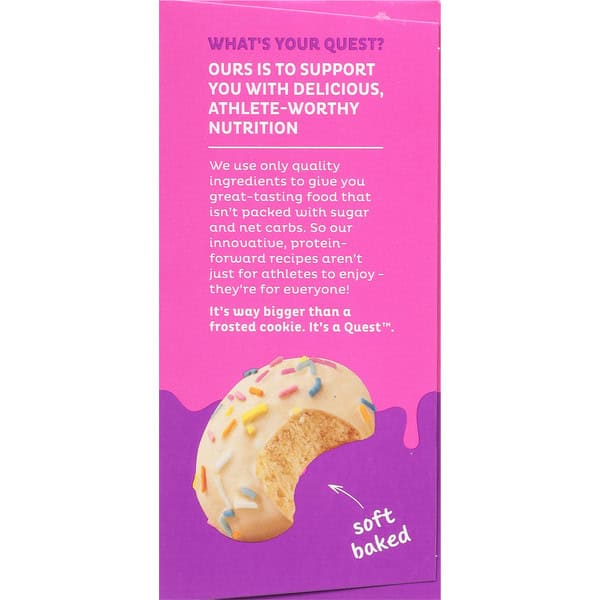Soft baked. Quest nutrition is on a mission to make the foods you crave work for you not against you. That’s why Quest Frosted Cookies are indulgent treats with <1 g of sugar, 1 g of net carbs, and 5 g of protein per cookie. Sound too good to be true? Tasting is believing.