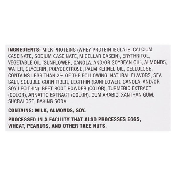 Milk Proteins (whey Protein Isolate, Calcium Caseinate, Sodium Caseinate, Micellar Casein), Erythritol, Vegetable Oil (sunflower, Canola, And/or Soybean Oil), Almonds, Water, Glycerin, Polydextrose, Palm Kernel Oil, Cellulose. Contains Less Than 2% Of The Following: Natural Flavors, Sea Salt, Soluble Corn Fiber, Lecithin (sunflower, Canola, And/or Soy Lecithin), Beet Root Powder (color), Turmeric Extract (color), Annatto Extract (color), Gum Arabic, Xanthan Gum, Sucralose, Baking Soda.