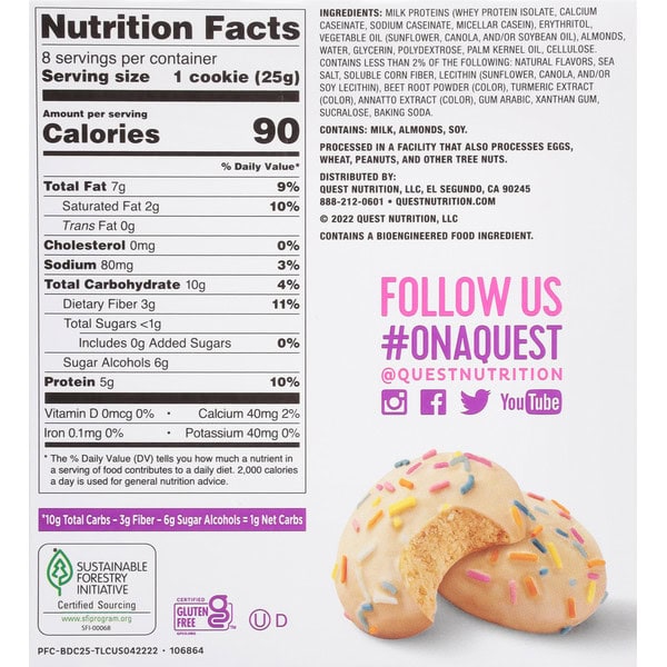 • QUALITY INGREDIENTS. Delight in the satisfying flavors and nutrients of Quest Frosted Cookies made with quality ingredients.