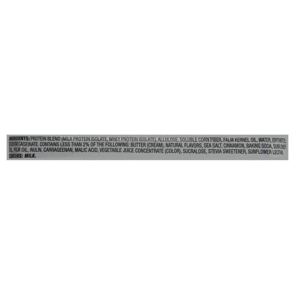 Protein Blend (milk Protein Isolate, Whey Protein Isolate), Soluble Corn Fiber (prebiotic Fiber), Allulose, Palm Kernel Oil, Erythritol, Butter, Water, Contains Less Than 2% Of The Following: Natural Flavors, Sea Salt, Cinnamon, Baking Soda, Palm Oil, Cellulose Gum, Xanthan Gum, Carrageenan, Malic Acid, Color (vegetable Juice), Sucralose, Sunflower Lecithin
