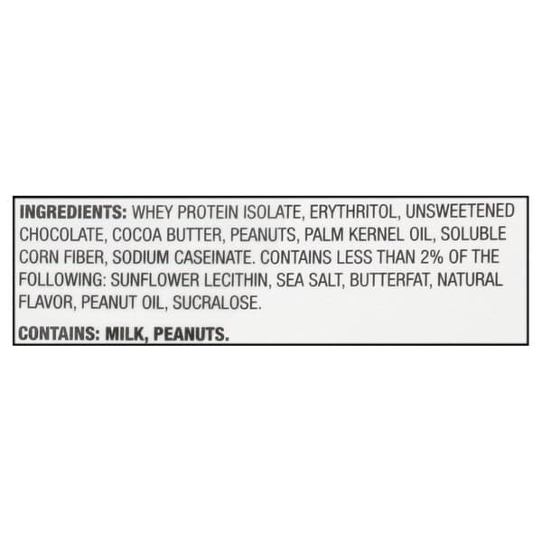 Whey Protein Isolate, Erythritol, Unsweetened Chocolate, Cocoa Butter, Peanuts, Palm Kernel Oil, Soluble Corn Fiber, Sodium Caseinate. Contains Less Than 2% Of The Following: Lecithin (sunflower And/or Soy Lecithin), Sea Salt, Butterfat, Natural Flavor, Peanut Oil, Sucralose.