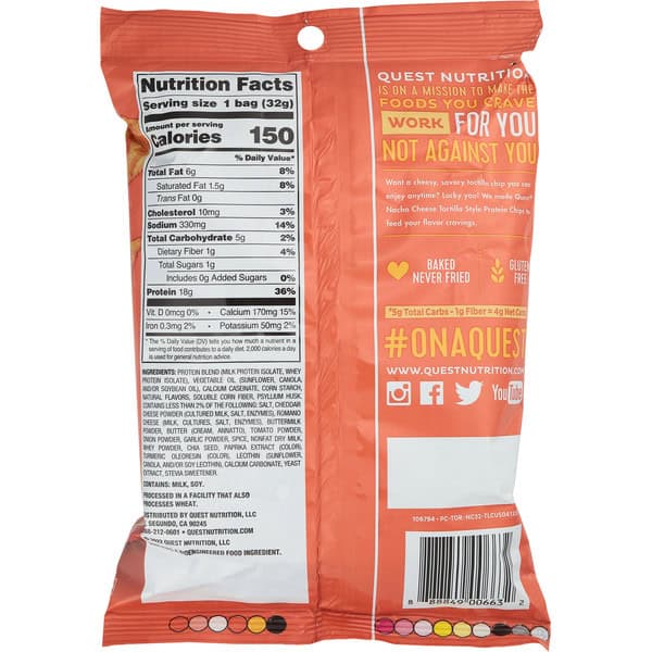Per Serving: 18 g protein. 4 g net carbs (5 g carbs – 1 g fiber = 4 g net carbs). Certified Gluten-free. No added soy ingredients. Quest Nutrition is on a mission to make the foods you crave work for you not against you. Want a cheesy, savory tortilla chip you can enjoy anytime? Lucky you! We made Quest Nacho Cheese Tortilla Style Protein Chips to feed your flavor cravings. Baked never fried. www.questnutrition.com. (hashtag)onaquest. Instagram. Facebook. Twitter. YouTube. Made in USA with domestic and imported ingredients.